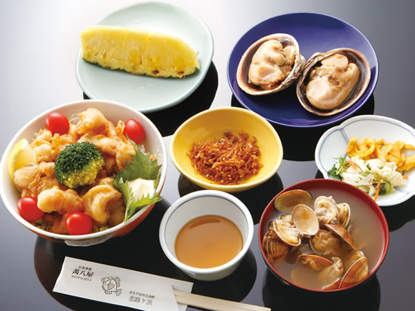 恋路ヶ浜 萬八屋 上カリカリ丼 地元の魚介類や野菜をふんだんに使った「上カリカリ丼」は、見て食べて楽しめるオリジナルな一品。 充実のサイドメニューも魅力です。 住 所 田原市伊良湖町古山2814-4 電 話 0531-35-0007 営業時間 9:00〜17:00 ※ランチ10:30~16:00(LO15:00) 定休日 不定休(月1回) URL ホームページはこちら ※貝づくしメニューの詳細は施設までお問い合わせください。